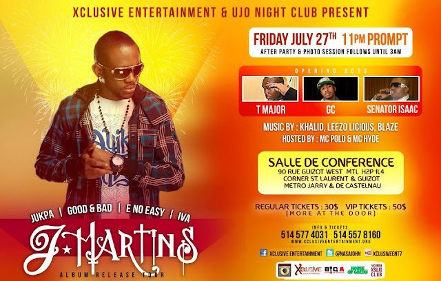 (Montreal, Quebec- July 24, 2012) - Xclusive Entertainment presents International Nigerian artist J. Martins in concert July 27, 2012 in Montreal, Quebec. The concert features J. Martins with local talents; Debleu Kinanga, T-Major, GC, Senator Isaac, and hosts MC Polo and MC Hyde. Music will be provided by Khalid, Leezo Licious, and Blaze. The concert starts promptly at 11pm at Salle De Conference, located at 90 Rue Guizot West, Montreal H2P 1L4. An After-party and photo session with J. Martins takes place right after the concert has ended until 3AM. Advance tickets are on sale for $30, VIP $50 and more at the door. The public can call for tickets and information at: (514) 577-4031 or (514) 557-8160